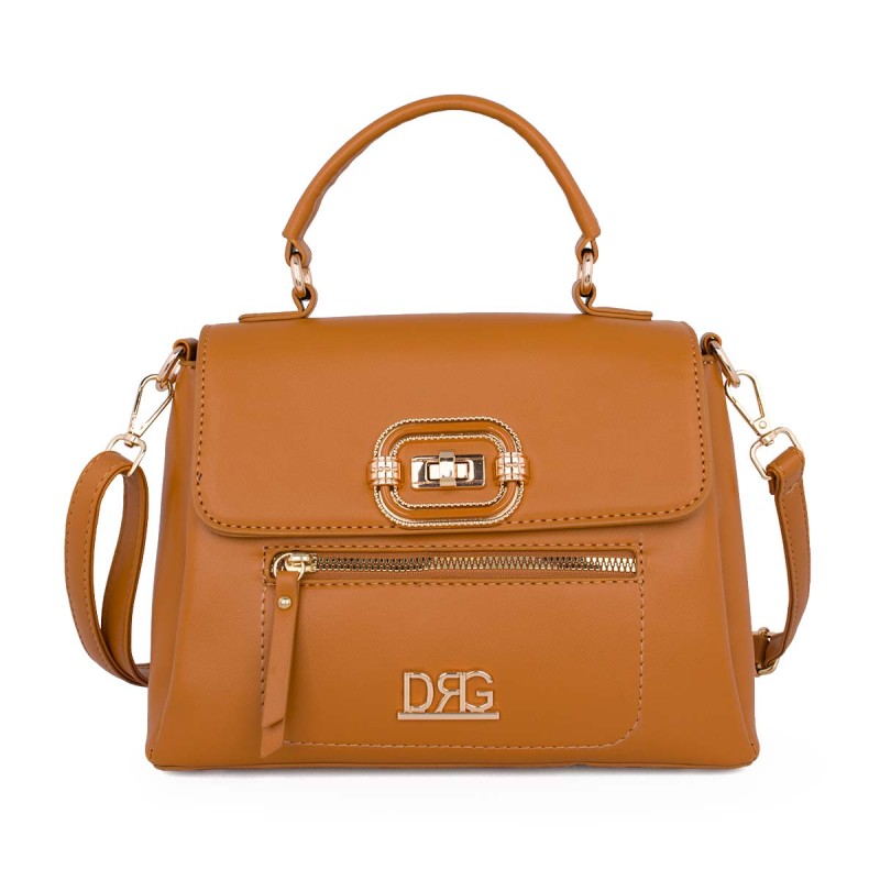 Women's Crossbody Bag, Camel. Eco-leather. It features 3 separate internal compartments, 1 internal zip pocket, and 1 external zip pocket on the front. Closes and secures with a metal fastening and zipper. Adjustable, detachable crossbody strap. Dimensions: H 20cm, W 26cm, D 12cm "Designed in Greece exclusively by De Raggi designers".