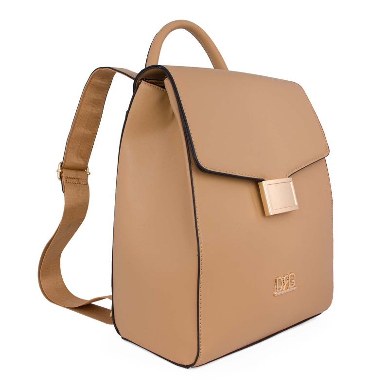 Women's backpack beige. Eco-leather. It features 2 internal compartments with a divider in the middle, 2 internal slots with one zippered, and 1 external zippered pocket at the back. Besides the flap, it also closes with a zipper. Dimensions: H 32cm, W 26cm, D 14cm. "Designed in Greece exclusively by De Raggi designers".
