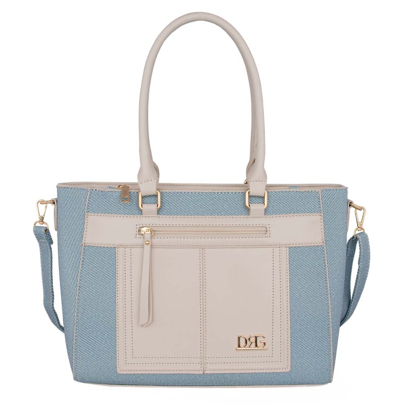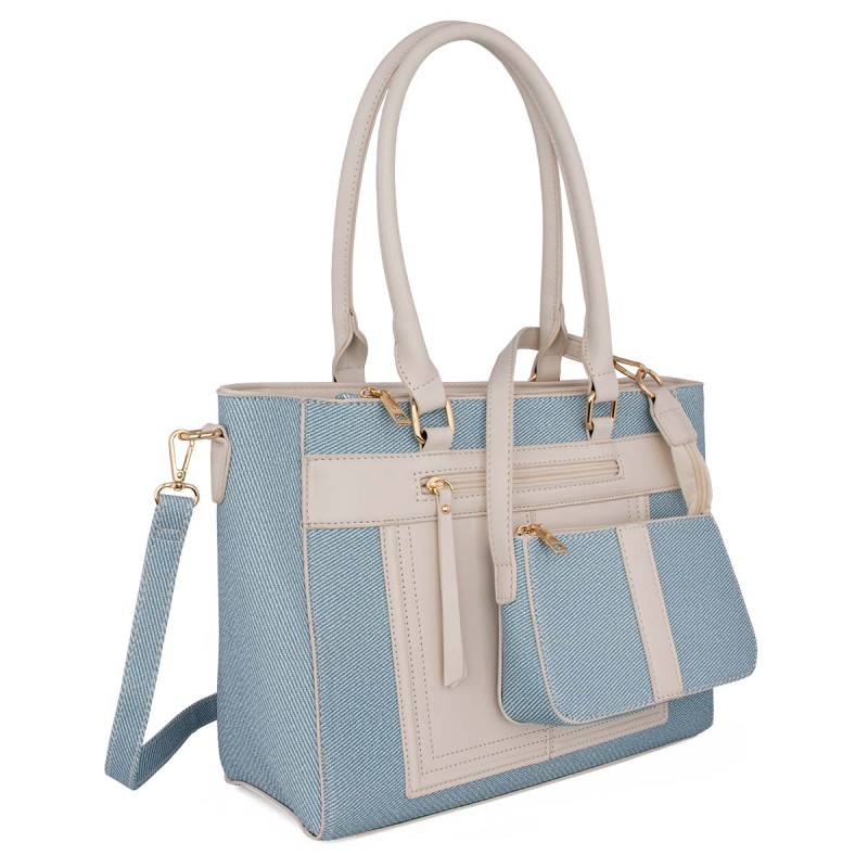 Women's white shoulder bag. Eco-friendly leather. It has 2 internal compartments, one with a zipper, and 3 external pockets with zippers on the front and back. Adjustable, detachable crossbody strap. Extra detachable pouch with zipper. Dimensions: H 28cm, L 34cm, W 12cm. "Designed in Greece exclusively by De Raggi designers".