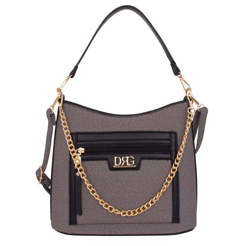 Women's black shoulder bag. Made from eco-leather. It features 2 internal compartments, one with a zipper, and 2 external compartments, both with zippers on the front and back. Adjustable, detachable crossbody strap, detachable shoulder strap, detachable chain. Dimensions: H 26cm, W 28cm, D 13cm."Designed in Greece exclusively by De Raggi designers".